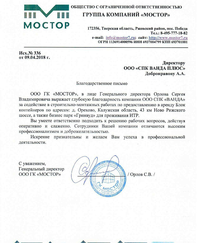 ООО ГК "МОСТОР", в лице Генерального директора Орлова Сергея Владимировича выражает глубокую благодарность компании ООО СПК "ВАНДА" за содействие в строительно-монтажных работах по предоставлению в аренду Блок контейнеров по адресам: д. Орехово, Калужская область, 43 км. Ново Рижского шоссе, а также бизнес парк "Гринвуд", для проживания ИТР.
